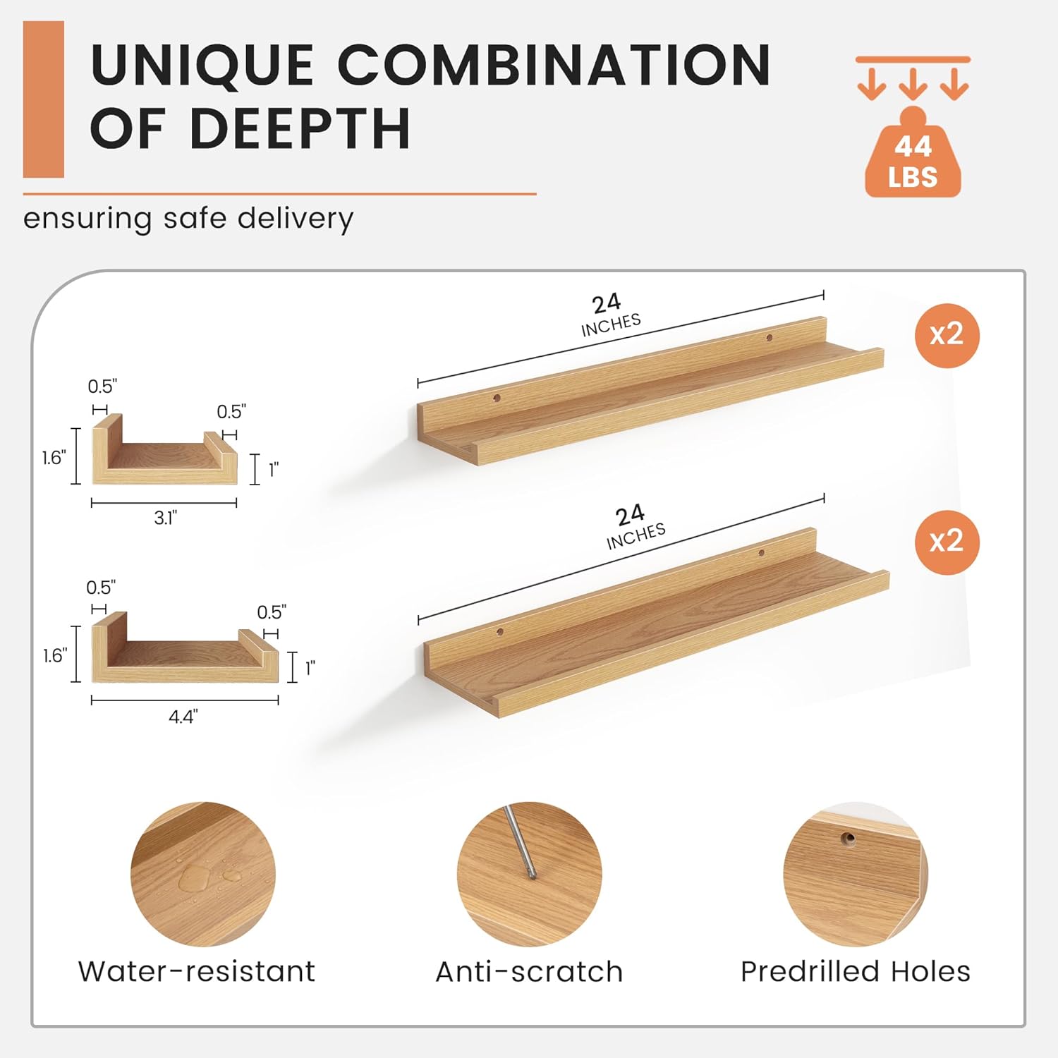 Floating Picture Ledge Shelves for Wall Set of 4, 24 Inch Wall Shelves with Lip Long Large Nursery Book Shelf for Toys Storage Kids Bookshelf Wall Mounted Living Room Bedroom Decor Frames
