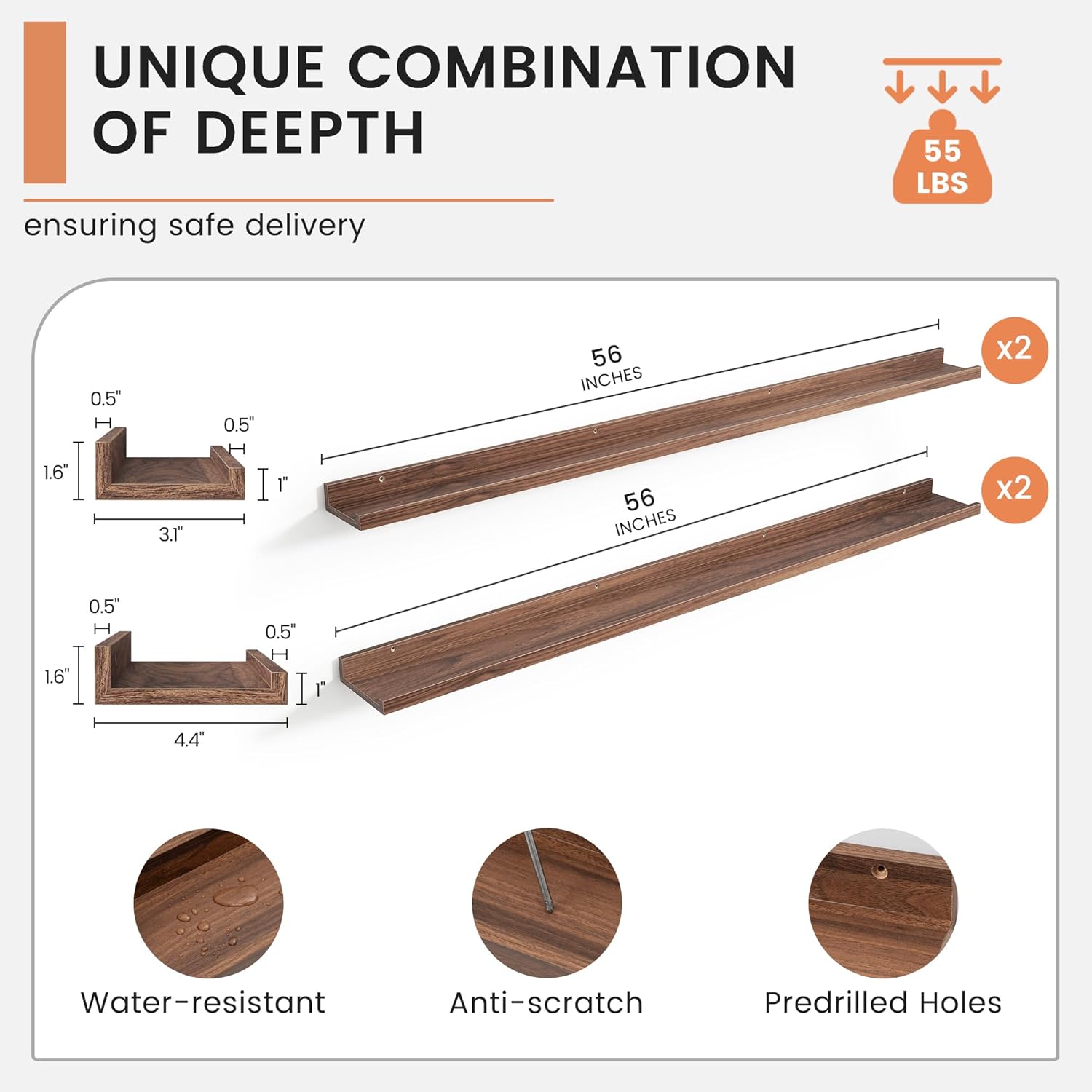 Floating Picture Ledge Shelves for Wall Set of 4, 56 Inch Wall Shelves with Lip Long Large Nursery Book Shelf for Toys Storage Kids Bookshelf Wall Mounted Living Room Bedroom Decor Frames