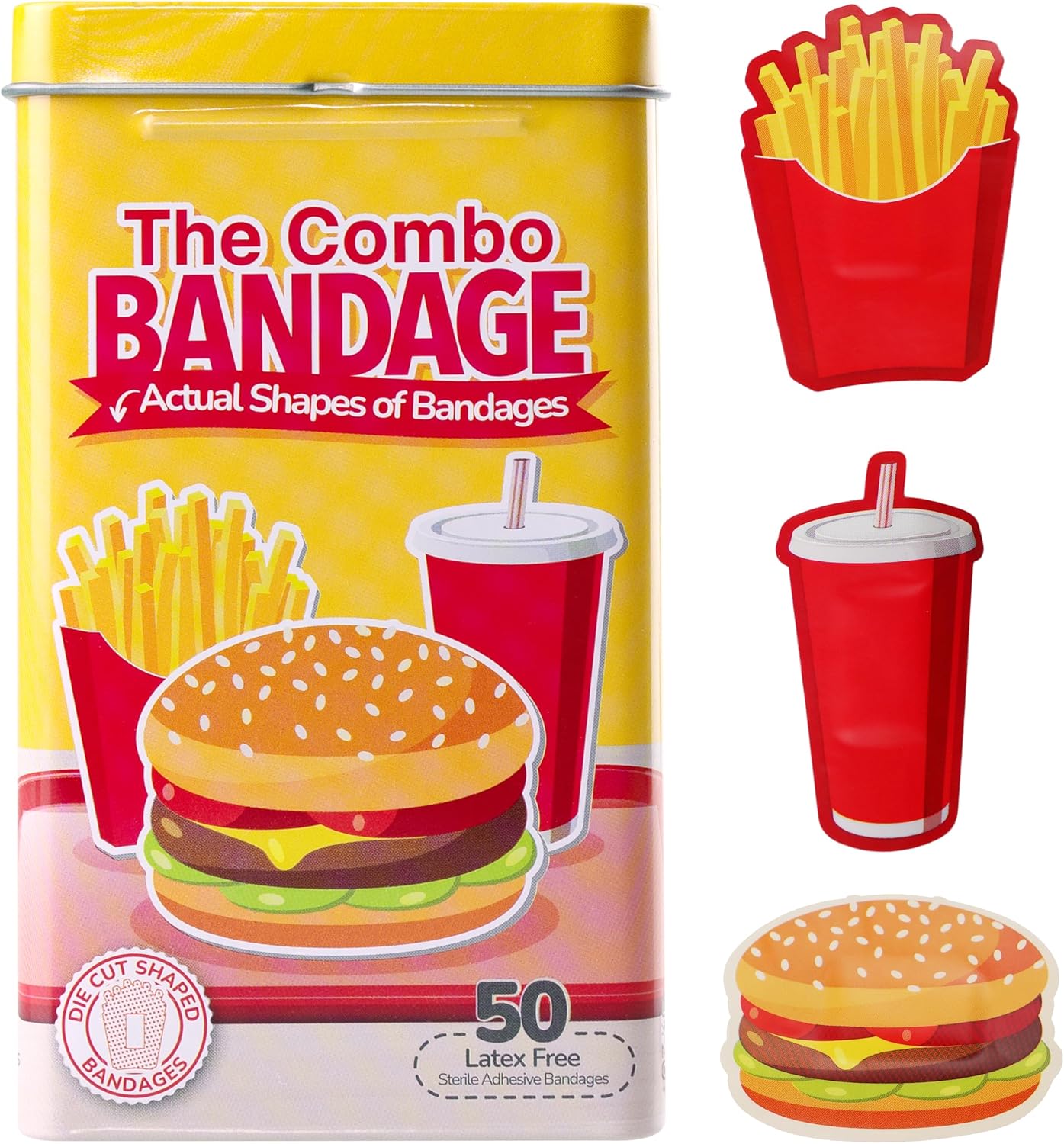 - COMBO MEAL BANDAGES: This 50 piece pack of adorable fast food shaped bandages is great for putting a smile on kids' faces while protecting wounds such as cuts, scrapes, and burns and comes in an assortment of french fries, burgers, and soda shapes; sticky bandages are perfect for kids and adults alike, and also for school nurses and pediatric doctors