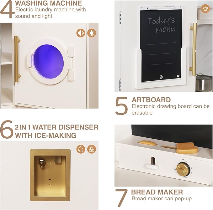 Large Wooden Corner Play Kitchen Sets with Ice Maker,Water Dispenser,Bread Maker,Washing Machine,Electronic Display,Toy Sink with Running Water,Stove with Light&Sounds, Birthday Gift for 3+Boys Girl