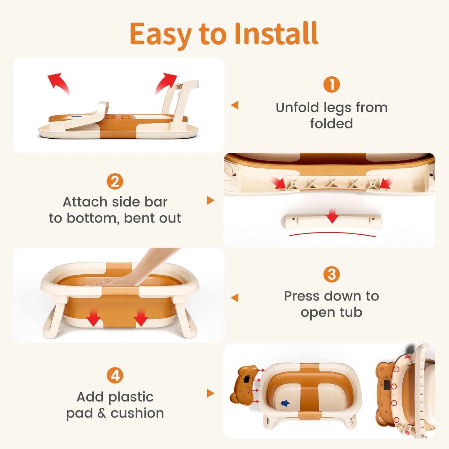 Collapsible Baby Bathtub with Soft Towel and Floating Cushion, Infant Bathtub for Newborn to Toddler (0-18 Month), Portable Baby Bath Tub for Travel (Brown Bear)