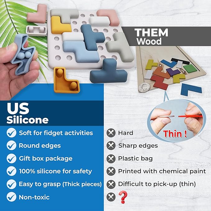 - [Distinctive Shape & Template Matching] Includes 13 Tetris-shaped silicone blocks for sorting, tangram-style logic challenges, and cognitive stimulation with templates