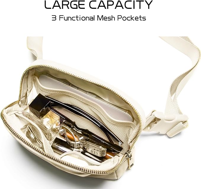 - [Keeps your stuff in order] To help you organise your daily essentials and keep everything you need close to hand, the Everywhere belt bag has two zipped pockets and three mesh pockets. It holds your cellphone, wallet, keys, lipstick, sunglasses and other essentials.