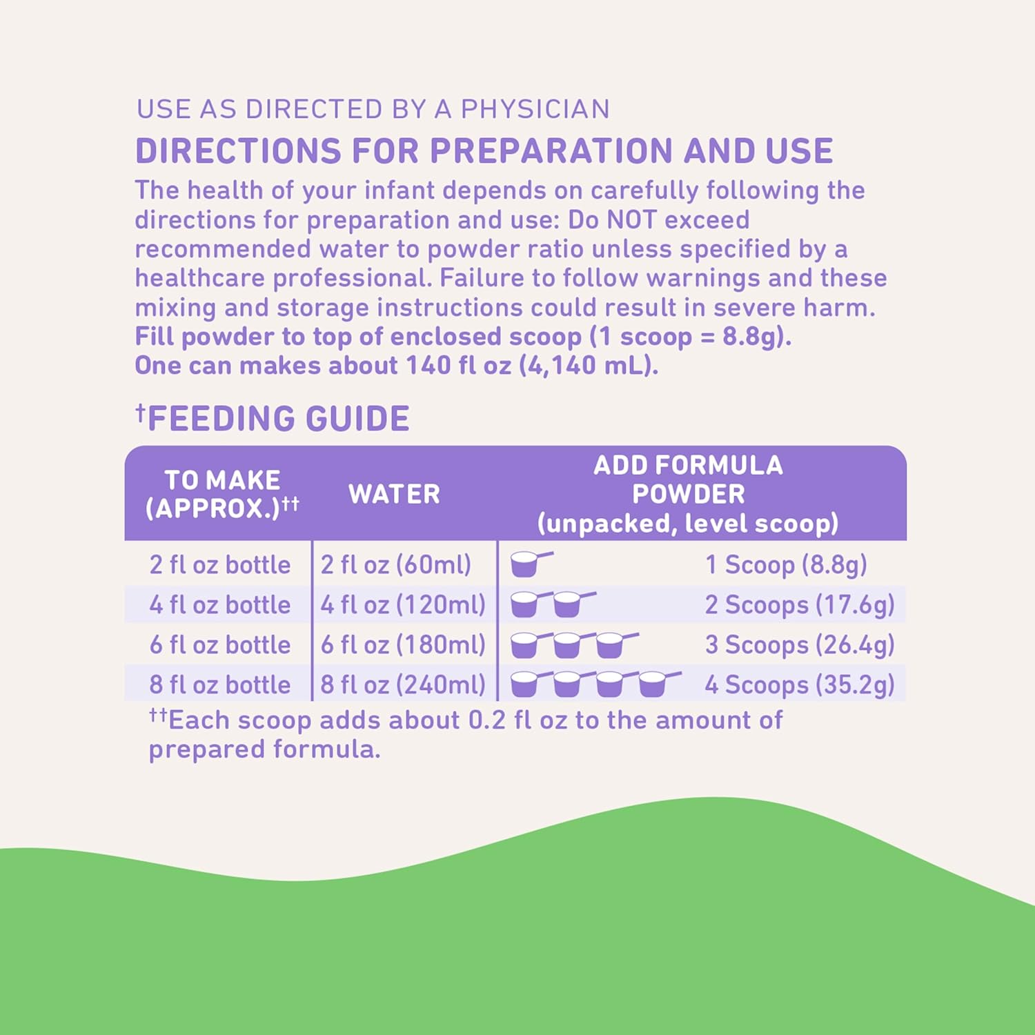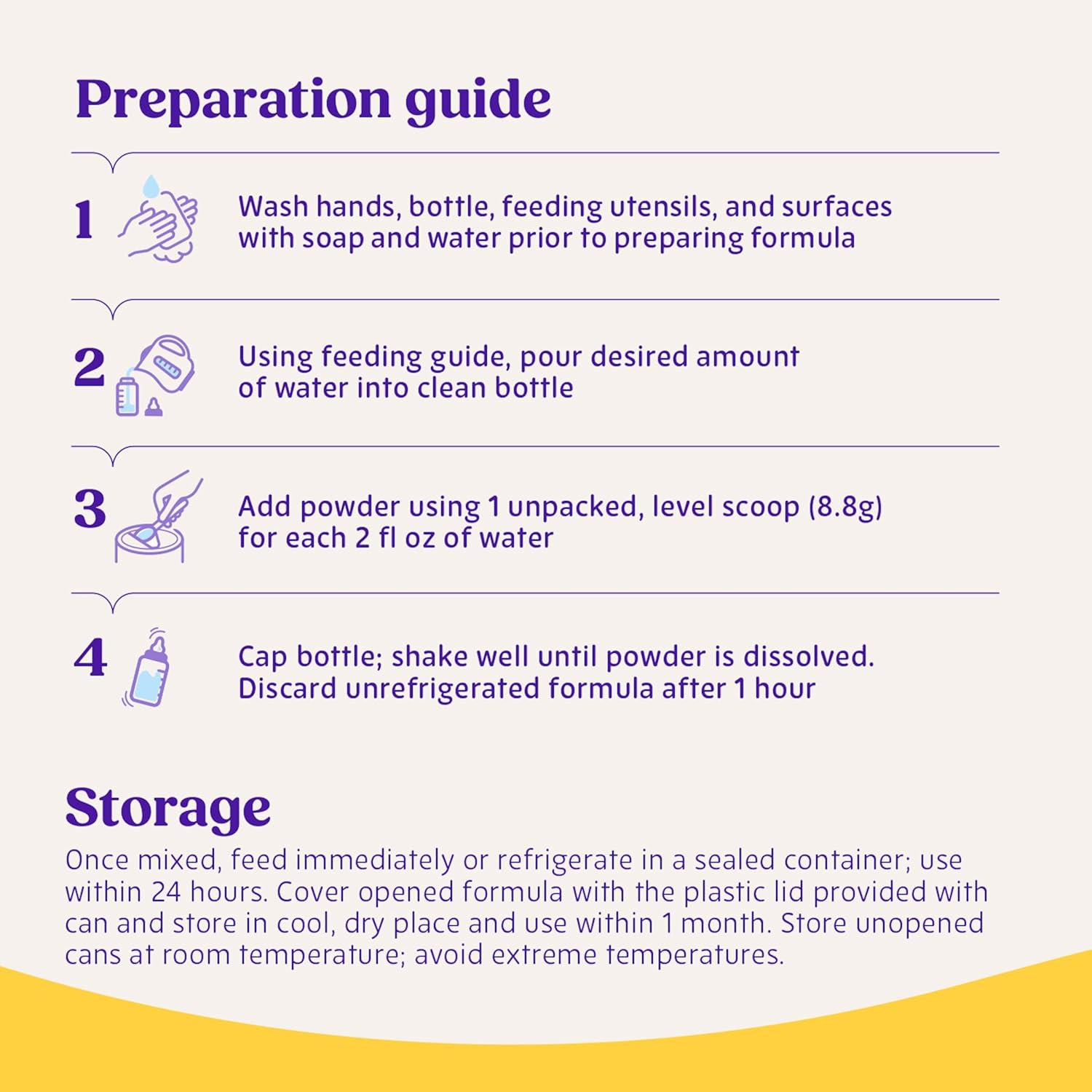 - PREPARATION INSTRUCTIONS: Wash hands, bottle, feeding utensils and surfaces with soap and water. Add powder using 1 unpacked, level scoop for each 2 fl oz of water. Cap bottle, shake well until powder dissolves. Discard unrefrigerated formula after 1 hour