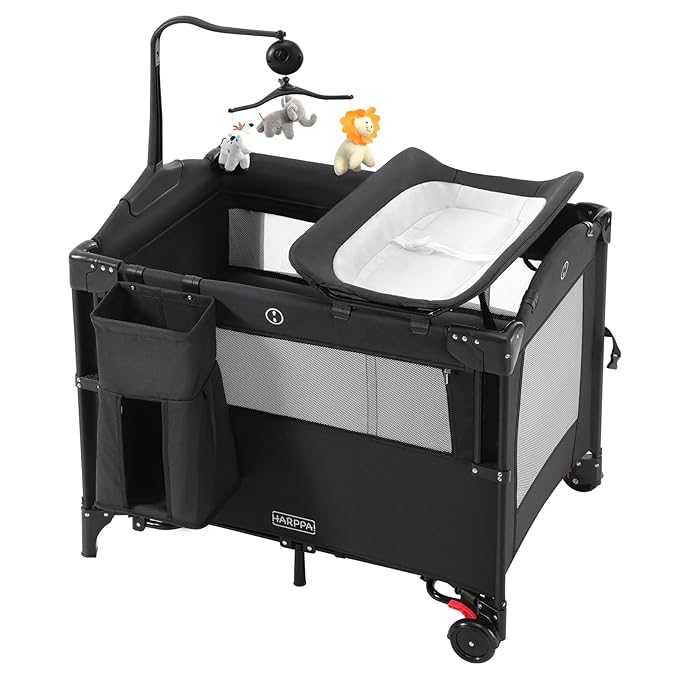 HARPPA Pack and Play 5 in 1, Portable Baby Playard for Travel, Baby Bassinet Bedside Sleeper with Mattress, Rolling Bassinet for Infant, Pack n Play with Changing Table, Bed Crib(Black)