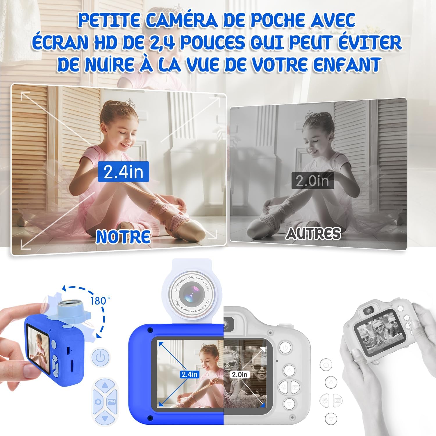 - 2.4in IPS Screen&More comfortable: The mini body is equipped with a 2.4 inch IPS HD screen (other suppliers only have a 2 inch screen) to provide your child with 1080p high-definition pixels; The larger botton is more comfortable for children's hands.