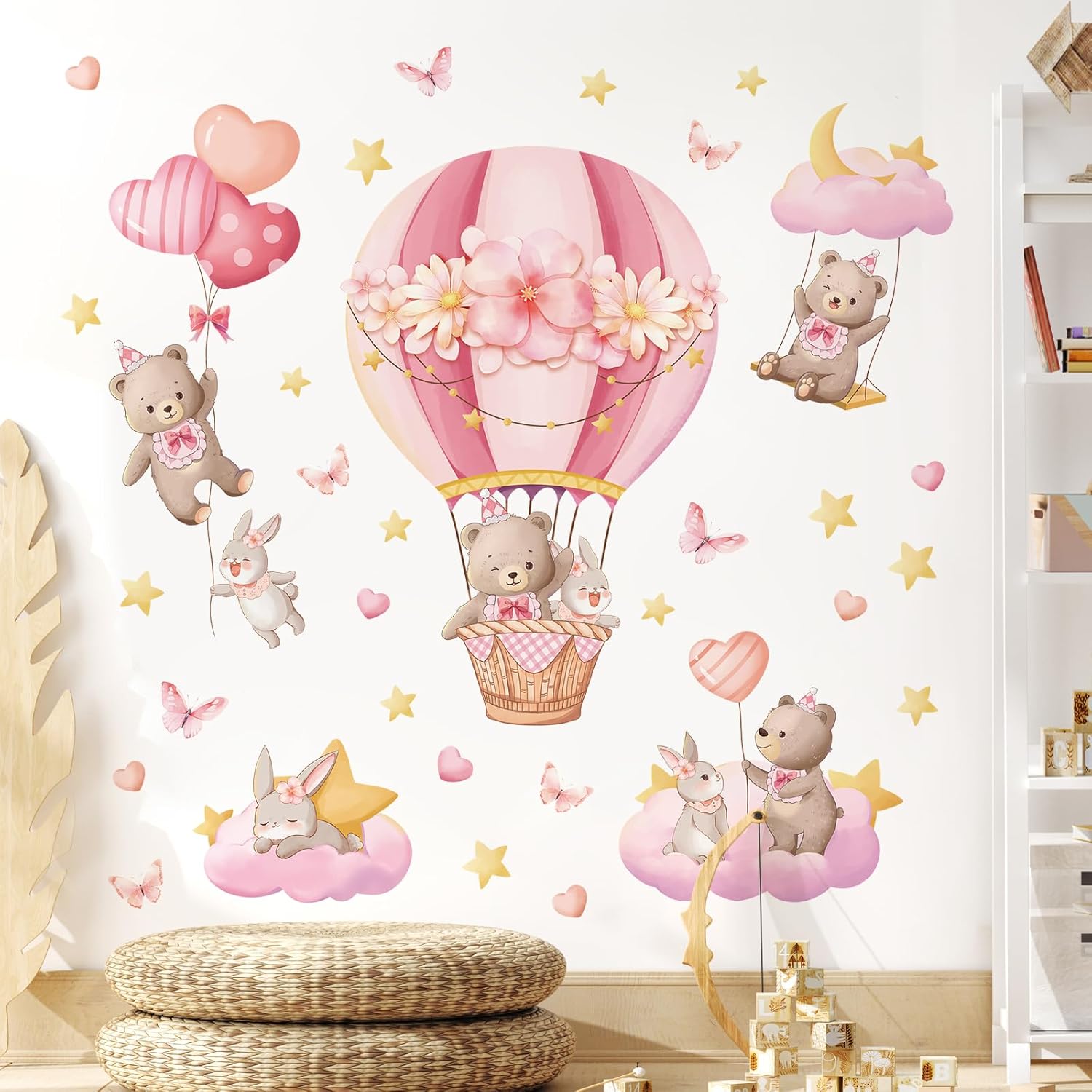 Tanlaby Pink Hot Air Balloon Wall Stickers Cartoon Bear Rabbit Stars Heart Wall Decals Peel and Stick Art Decor for Girls Bedroom Baby Nursery Kids Playroom Classroom