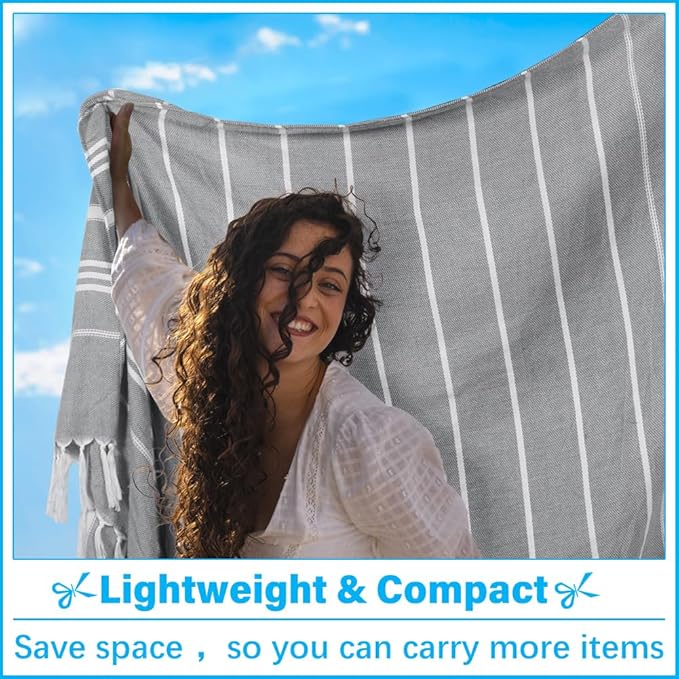 - LIGHTWEIGHT AND PORTABLE:Despite its large size,this turkish beach towel blanket is lightweight and thin,making it easy to fold and carry.Made from soft yet comfortable materials,it won’t weigh down your beach bag.Its compact design fits neatly into luggage or a backpack,perfect for travel and outdoor adventures