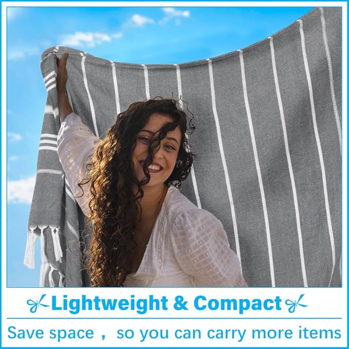- LIGHTWEIGHT AND PORTABLE:Despite its large size,this turkish beach towel blanket is lightweight and thin,making it easy to fold and carry.Made from soft yet comfortable materials,it won’t weigh down your beach bag.Its compact design fits neatly into luggage or a backpack,perfect for travel and outdoor adventures