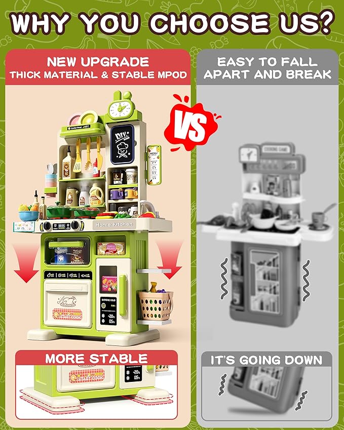 - 【NEW UPGRADE】Our new 33.8 inch kitchen playset uses higher quality materials, which not only surface is smooth and delicate, but also has a significant improvement in structure strength; New Tripods strengthen the design of the bottom support and solve the problem that is easy to turn over.