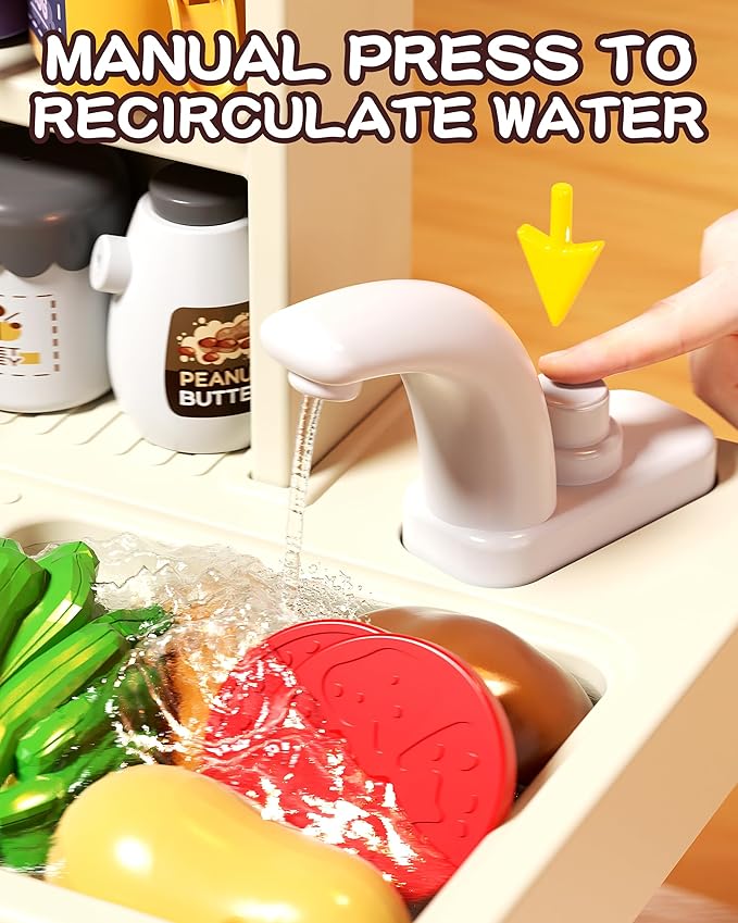 - 【Interactive Learning】Teach kids about water conservation and sustainability with the sink's water circulation system. Let them clean their play foods, plates, and utensils while having fun and enhancing environmental awareness.