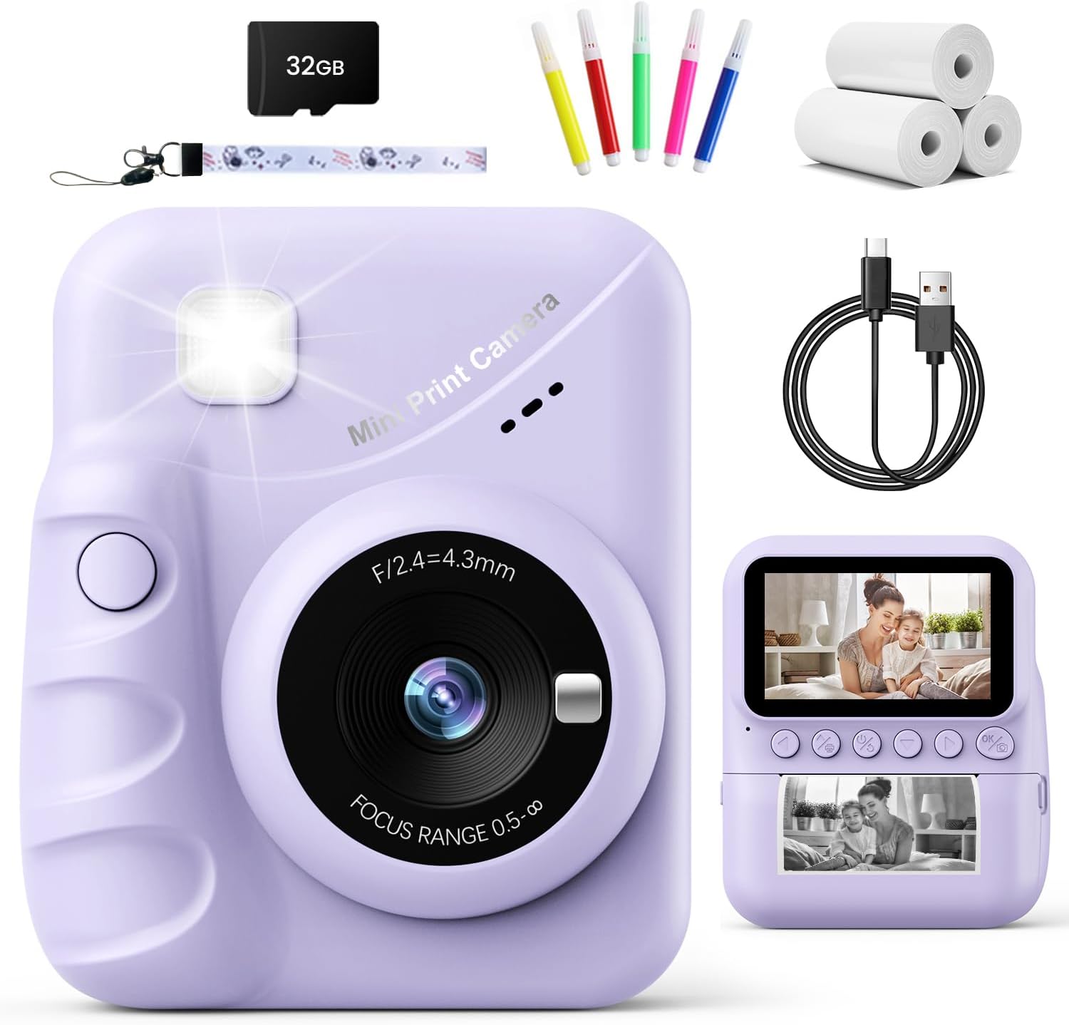 - TOYS FOR CHILDREN AGED 3-14: This toy camera is both a digital and instant camera. The design is compact and lightweight, and the buttons are simple to operate, making it easy for children to master. Package includes 3 rolls of printer paper, lanyard, charging cable, 32G card and color pens.