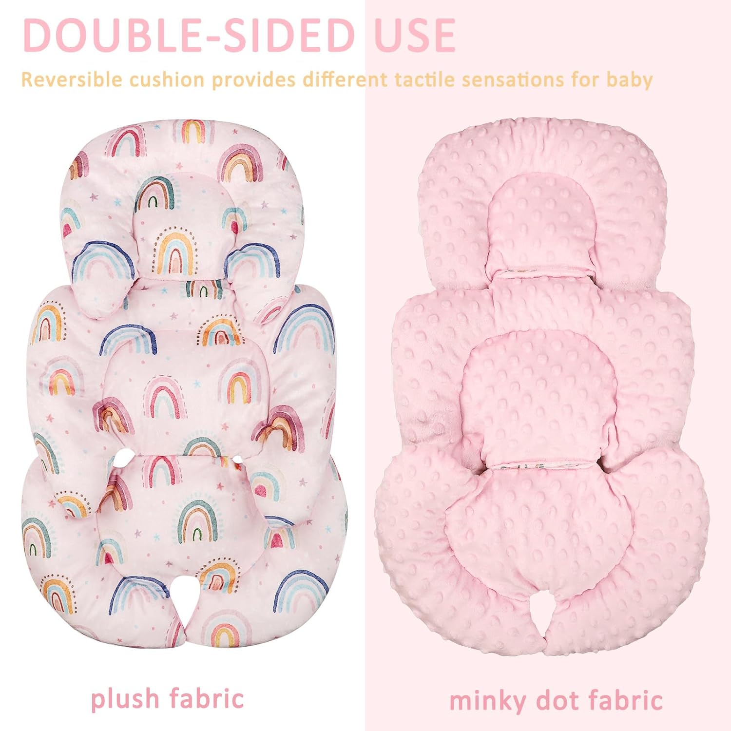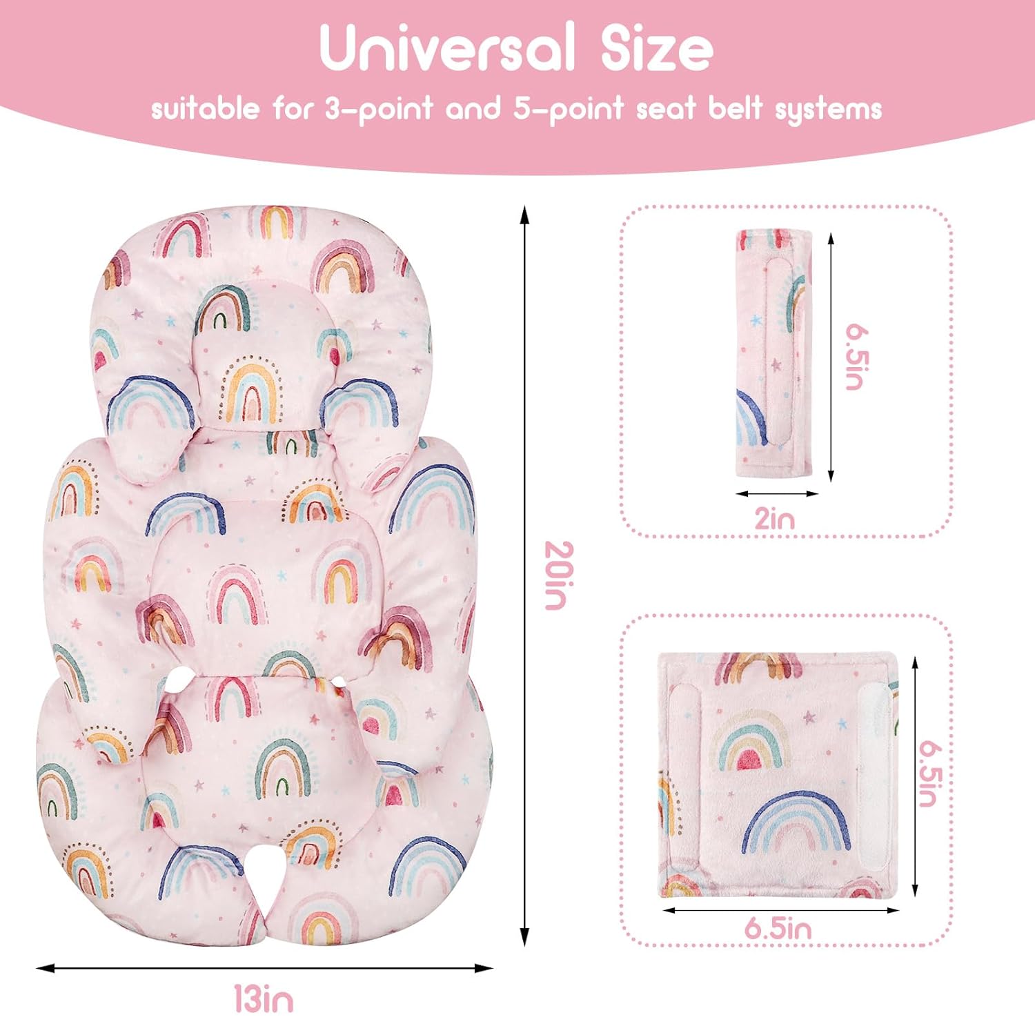 Infant Car Seat Insert, Car Seat Head Support Baby Girls Boys, Soft & Reversible Newborn Carseat Insert Cushion with 2 Strap Covers, for Stroller, Swing, Bouncer (Pink Rainbow)