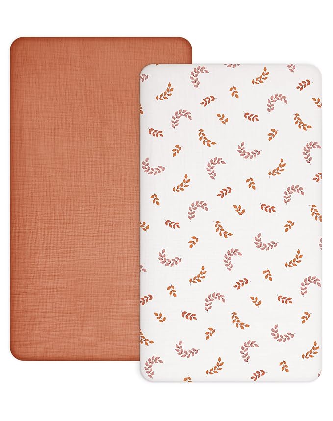 Crib Sheets for Baby Boy Girl 2 Pack, Fitted Crib Mattress Sheet 28" x 52", Muslin Toddler Bedding with Neutral Style, Nursery Bedding Essentials (Brick & Leaf)