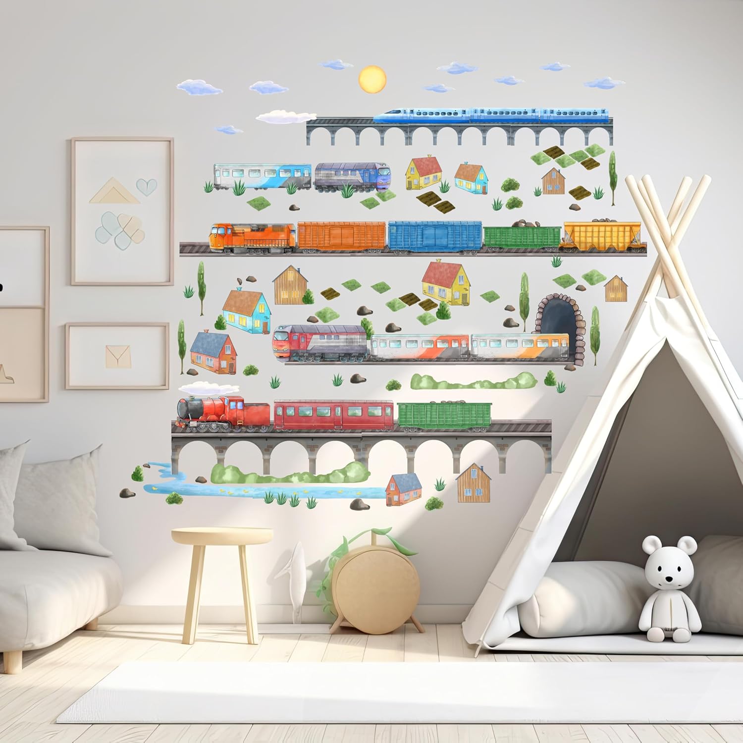 - ⭐ Instantly bring a boring wall to life with this nursery decor for kids' rooms, featuring a variety of locomotive, tube, carriage, train, bridge and railway stickers. Train wall decals come in a pack of 4 sheets. This set of stickers is size XXL and its size on the wall is 157"" x 98"
