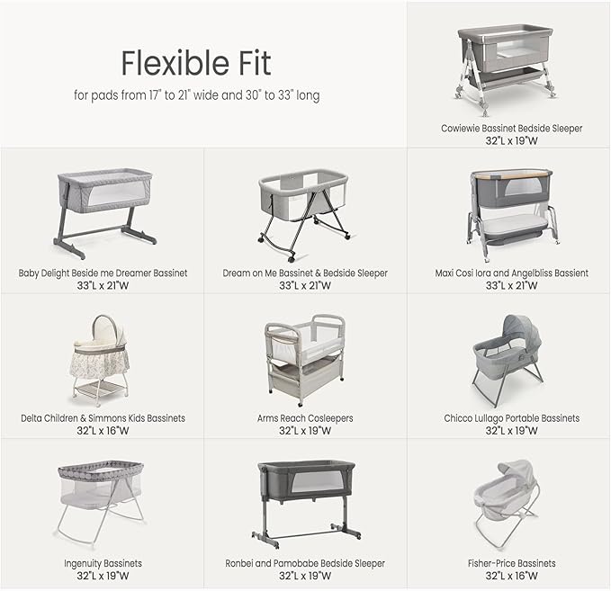 - Flexible Fitted: Bedside sleeper bassinet pads of different brands vary slightly in size. Our bassinet sheets sized at 33" x 21" with a depth of up to 4", can flexible fit for pads from 17”-21” wide, 29”-33” long and 1”-2” thick.