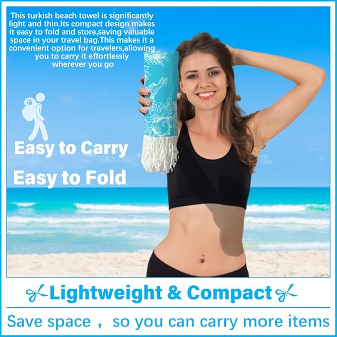 - LIGHTWEIGHT AND PORTABLE:Despite its large size,this turkish beach towel blanket is lightweight and thin,making it easy to fold and carry.Made from soft yet comfortable materials,it won’t weigh down your beach bag.Its compact design fits neatly into luggage or a backpack,perfect for travel and outdoor adventures