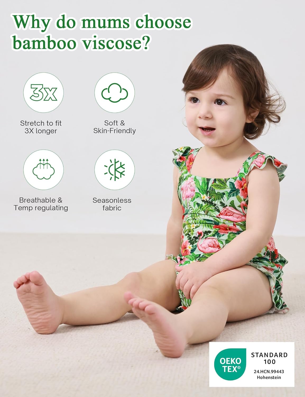 • Bamboo Viscose Fabric: Made from high-quality bamboo viscose, this baby girl bodysuit is soft and breathable, providing a silky feeling. It features four-way stretch, making it perfect for active little ones