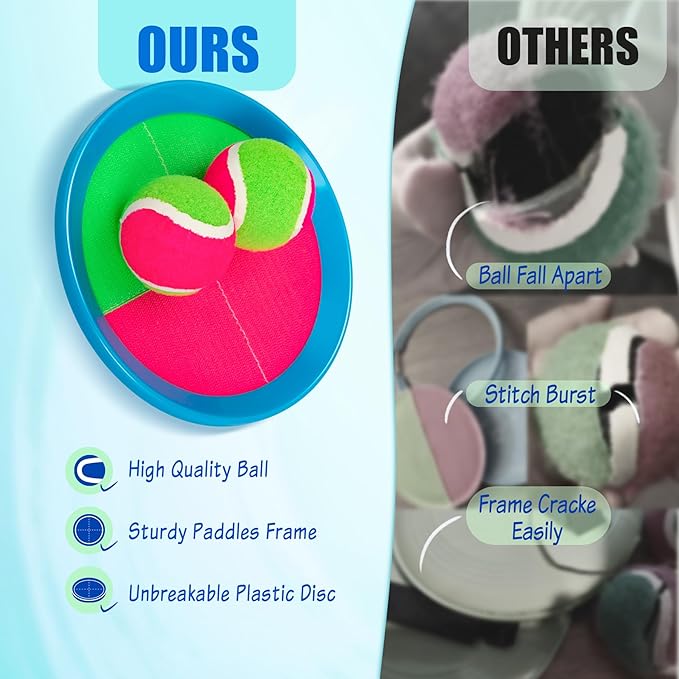 - 【High-Quality Waterproof Materials】 Our toss and catch ball set features upgraded ABS and nylon materials, ensuring exceptional durability and water resistance. The high-quality construction includes tightly stitched paddles and balls that withstand frequent play, while the reinforced bottom of the paddles minimizes impact and damage, making it ideal for outdoor fun in any condition.