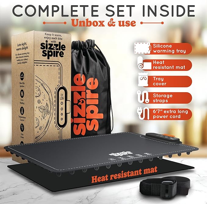 - Rapid and Even Heating: Sizzle Spire Silicone Warming Tray offers 5 temperature modes (Low 60°C, Medium 80°C, High 100°C, Thaw 40°C, Rise 40°C) to keep your dishes warm. Features uniform surface heating and an adjustable timer (1-4 hours) for added convenience. Ideal for maintaining food warmth and thawing frozen items