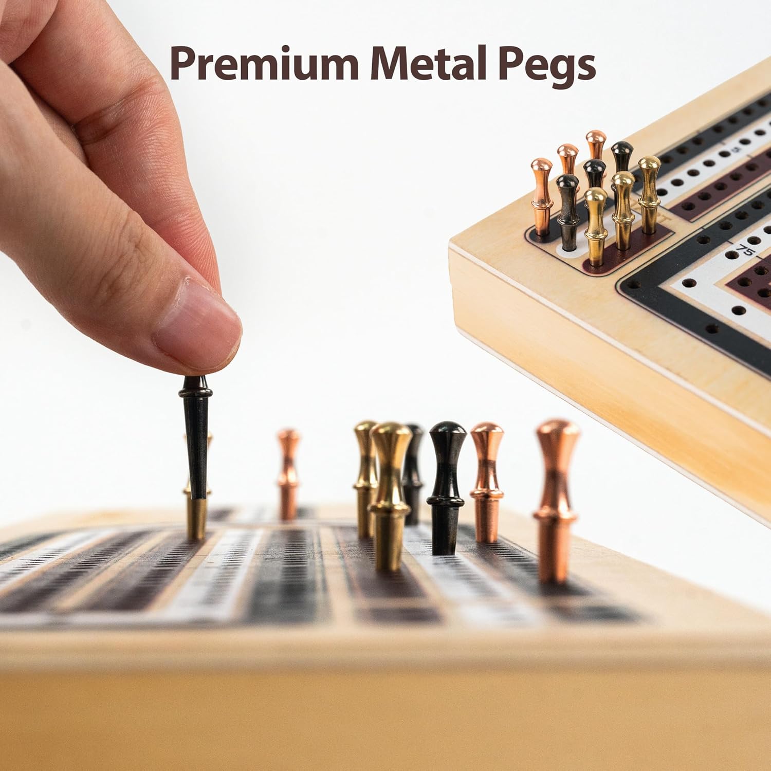 - Spacious Storage with Secure Magnetic Lock: Keep all components organized in the roomy built-in compartment, which neatly holds 9 durable metal cribbage pegs( rose gold, brass, and black)and 2 decks of cards. Three strong magnetic lock latches tightly, protecting pieces from loss during travel—no more loose pegs or missing cards, whether at home or on the go. Tips: Please remove both decks of cards and the pegs before playing