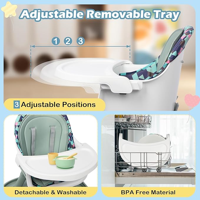 - STABLE & SAFE DESIGN: Safety is a priority with the 5-point harness, shoulder pads, and stable pyramid structure. The high chair's height can be adjusted for better stability and to suit various dining surfaces, ensuring your child remains secure. The enlarged non-slip feet provide added balance