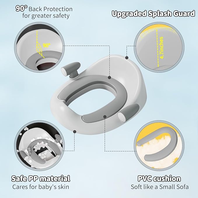 - ADJUSTABLE HEIGHT AND EASY TO CLEAN DESIGN: This combination of Toilet Seat and 2 Step Stool is suitable for adult toilets of any height. We also add a soft cushion on this toilet training seat, your children will feel more comfortable with toddler potty seat. The cushion and splash guard is removable that make clean easier