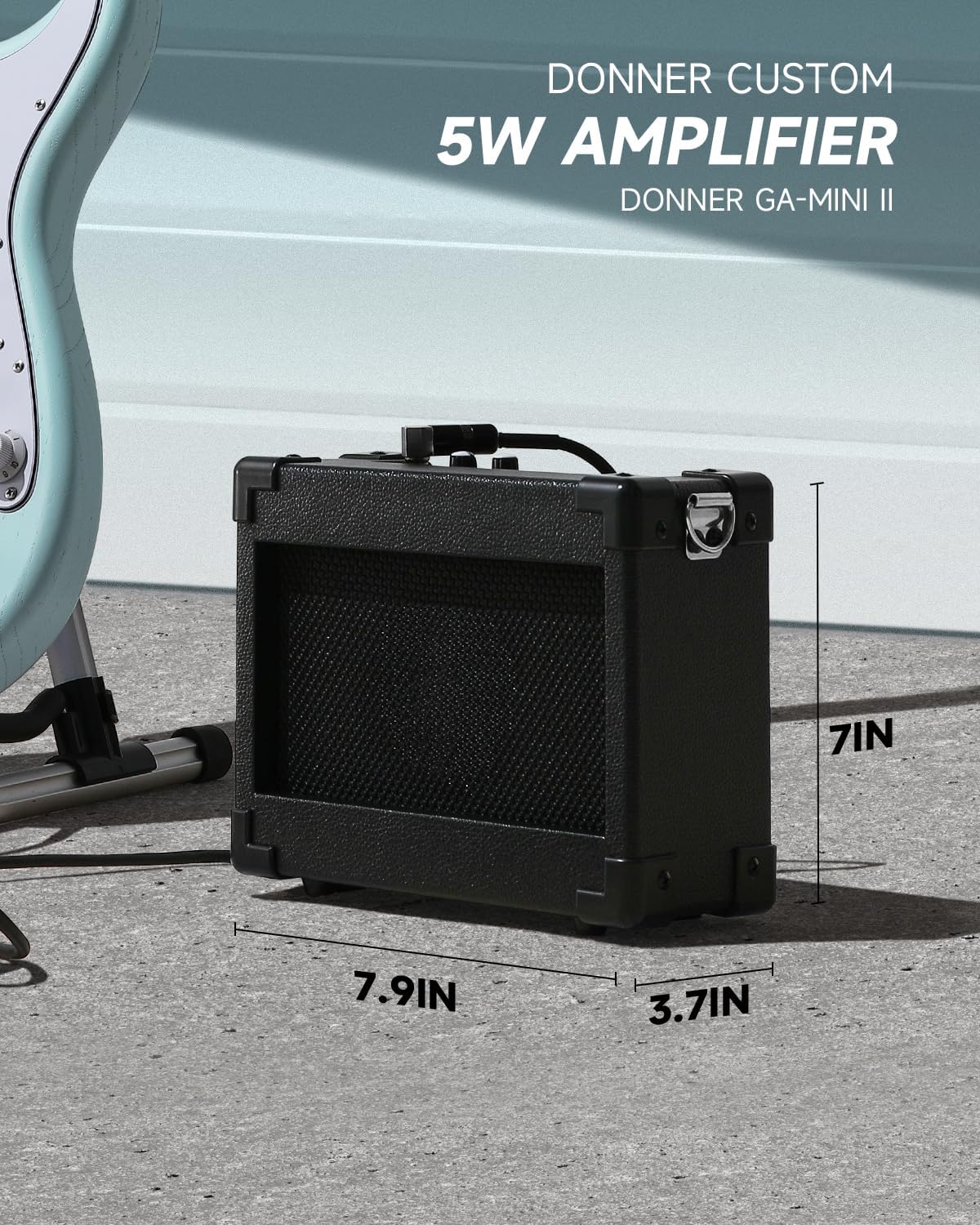 - COMPLETE BEGINNER’S PACKAGE:Open the box, and you’re ready to play. This beginner kits includes the DST-80 electric guitar, custom 5W amplifier, durable gig bag, capo, strap, extra strings, digital tuner, amp cable, picks, and access to free online lessons from Donner to help you grow and shine