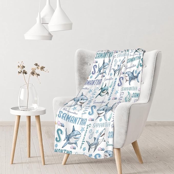 Personalized Baby Blanket for Girls Boys Kids Shark Custom Baby Blanket with Name Throw Birthday Gift for Toddlers Infants Shower Newborns Nursery Stroller Crib Bed Decor