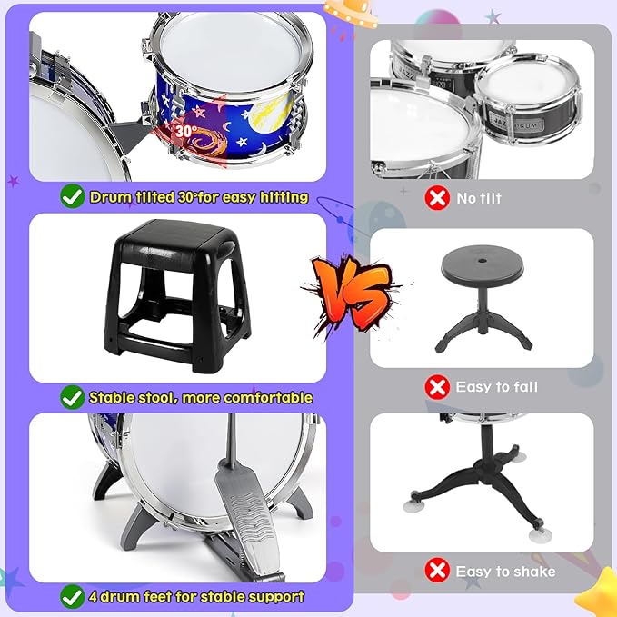 - Safe and Comfortable Design: This toddler drum set has a taller main stand and double-ply construction to prevent falling off. The drums are angled at 30° for easy play. All of this is designed to ensure stability and comfort for toddlers.