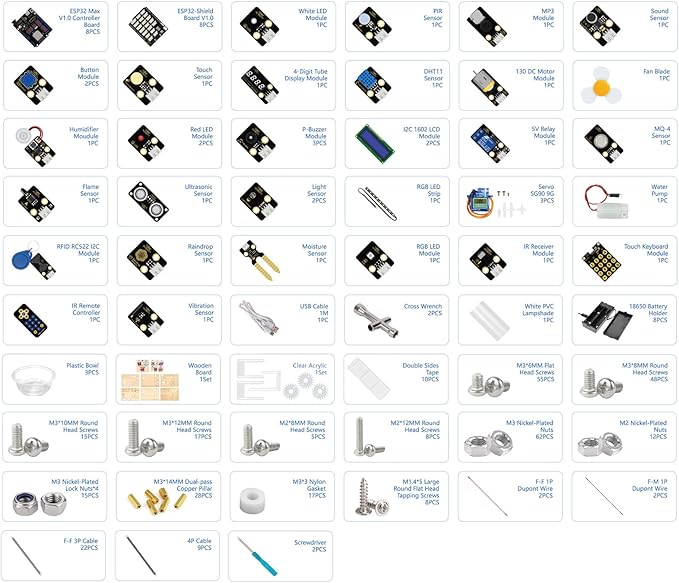 - 【8 Independent Multifunctional Smart Kits】: The 8-piece Set learning kit has 8 controller boards, which can build 8 independent smart systems at the same time: easily adapt to three scenarios of smart lighting, smart entertainment and smart temperature and humidity control, from automatic pet feeder, automatic clothes drying rack, smart access control, smart security alarm system, automatic watering system. Unleash your imagination with the versatility of our kits!