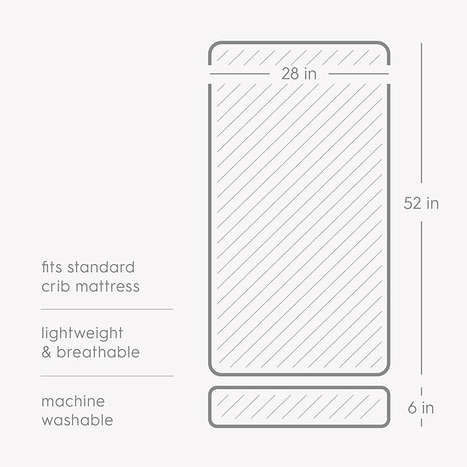 - Snuggly fits standard crib mattress: 52 in x 28 in
