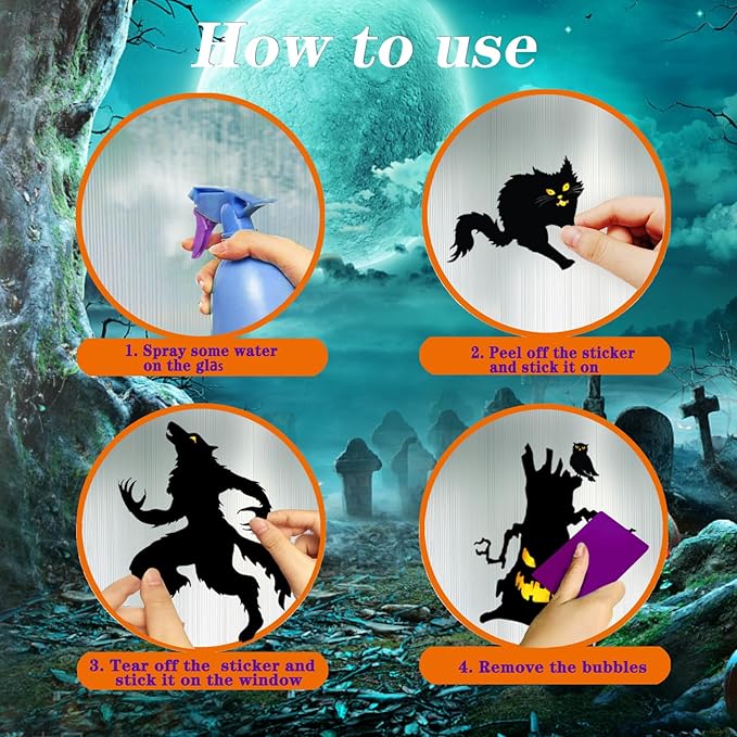 - Our Halloween clings for glass windows are made of eco-friendly and PVC material, can be easily to stick on glass, mirror, windows, glass storm door and refrigerator, without glue, they are static, you can DIY your unique home. You can enjoy DIY time with your kids and friend with no difficulty in creating your Halloween decoration.