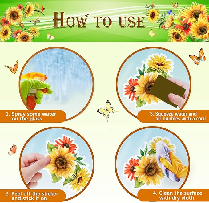 - Quality Assurance : We use the best quality materials and strict quality controls to produce these clings for windows , so that we can be sure of our products ' durability and longevity ! Sunflower stickers can be reused . There is no adhesive for window clings that are easy to use and peel off , will not damage glass , will not leave glue marks . No need glue , spray a little water on the surface before sticking it on window , water will make them stick better . Sunward window clings .