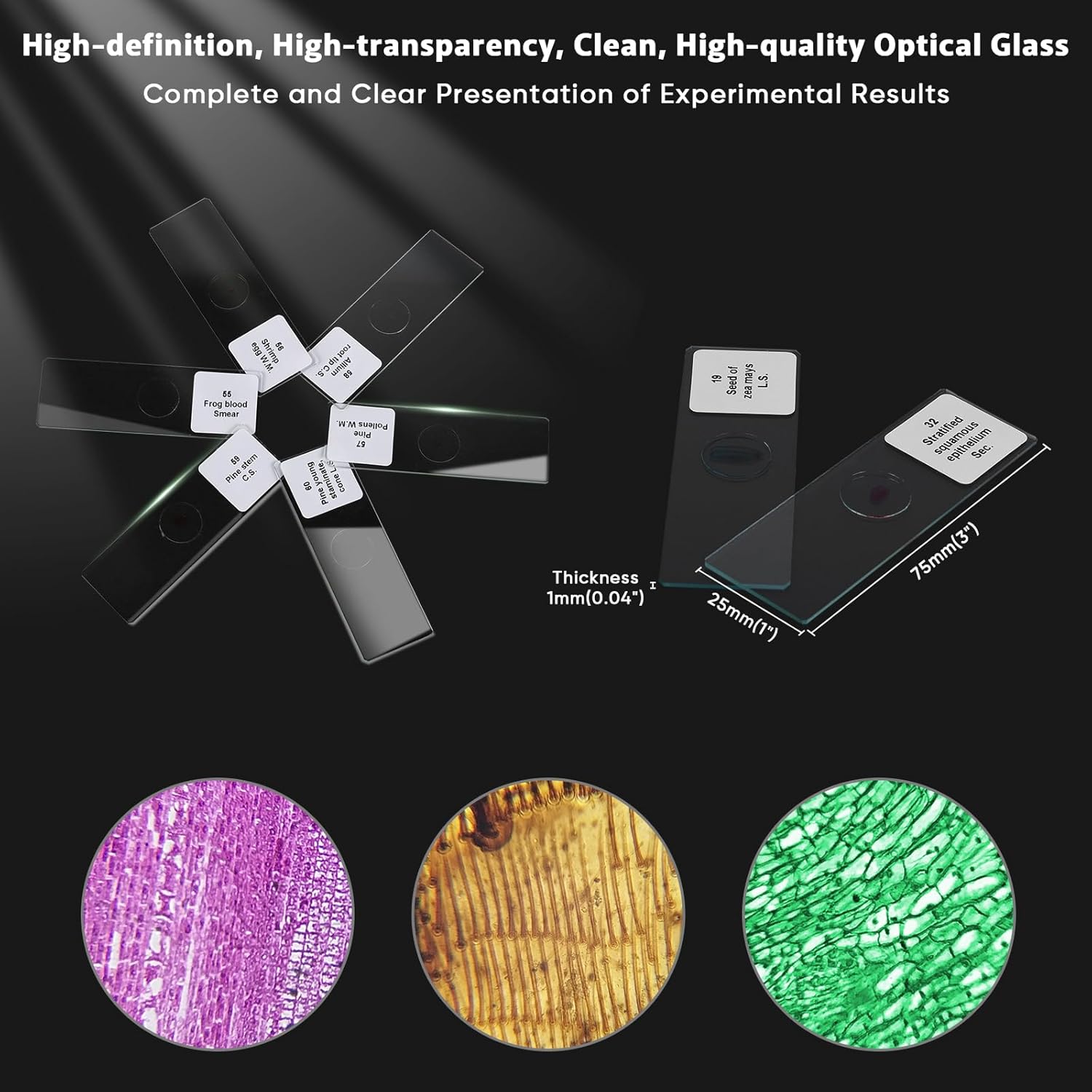 - Prepared Slides for Kids Microscope Are Sturdy and Thick, with A Standard Dimensions: 1" x 3" (25mm x 75mm), and Can Be Easily Clamped by Any Type of Microscope. Glass Slides for Microscope Are Made of High-definition and High-transparency High-quality Optical Glass. Light Can Easily Pass Through The Glass, Making Prepared Microscope Slides with Specimens for Kids 8-12 Image Clear and Presenting The Experimental Results Intact