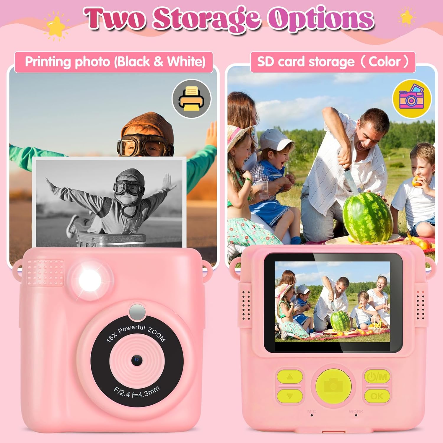 - Children's Gifts That Bring Happiness:Our camera kit includes 1x Instant Print Camera,3 rolls of printing paper (can print over 350 photos), 1x 32GB memory card (can store thousands of photos), 1x lanyard, and 1x USB Type-C cable.There are 3 colors of cameras to choose from.This mini camera toy is the perfect birthday, Easter, Christmas, holiday gifts for boys and girls aged 3-12.Let your kids have their first toy camera