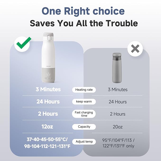 - Long-Lasting Battery: 4 ounces (120 ml) of breast milk with an initial temperature of 4 degrees can be heated to 37 degrees 6 times, giving you peace of mind for a full day out.Bottle warmer on the go precisely controls the temperature of nutritious breast milk/formula through an LED display. Features dry-burning protection without water and an anti-Anti-accidental touch physical button.