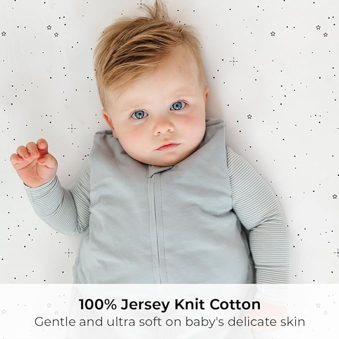 - Premium Jersey Cotton: Crafted from 100% jersey knit cotton, these fitted sheets offer a soft, breathable layer for your baby's delicate skin. The naturally stretchable, wrinkle-free fabric ensures a snug and cozy fit.