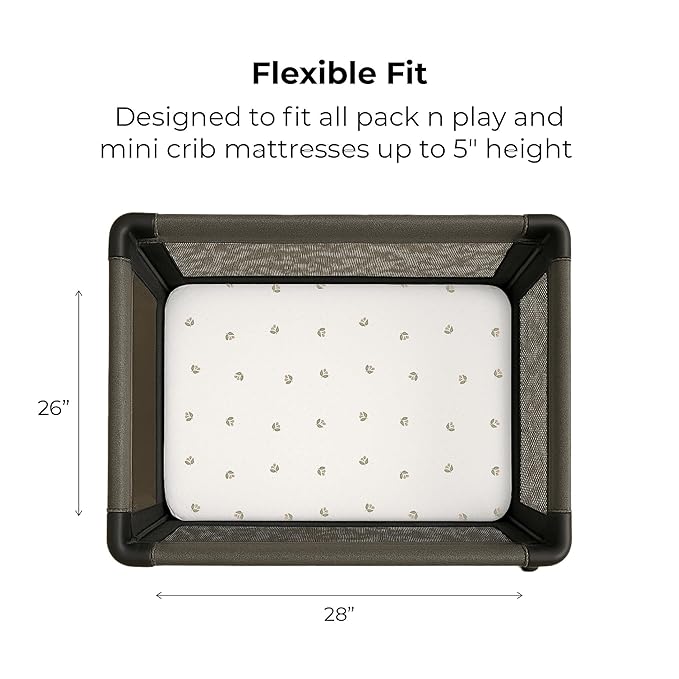 - Flexible Fit for Standard Pack n Play and Mini Crib Mattresses: Our sheets, sized at 38”x24”x5”, feature an innovative elastic band for adaptable stretch and a secure fit. Designed for standard Pack and Play mats (39”x27”x0.5”), portable, and mini crib mattresses (38”x24”x3”), the elastic ensures the sheet stays snugly in place on mattresses up to 5 inches thick. Compatible with Graco Pack n Play and other standard playards and playpens, it provides a smooth, safe surface for your baby.