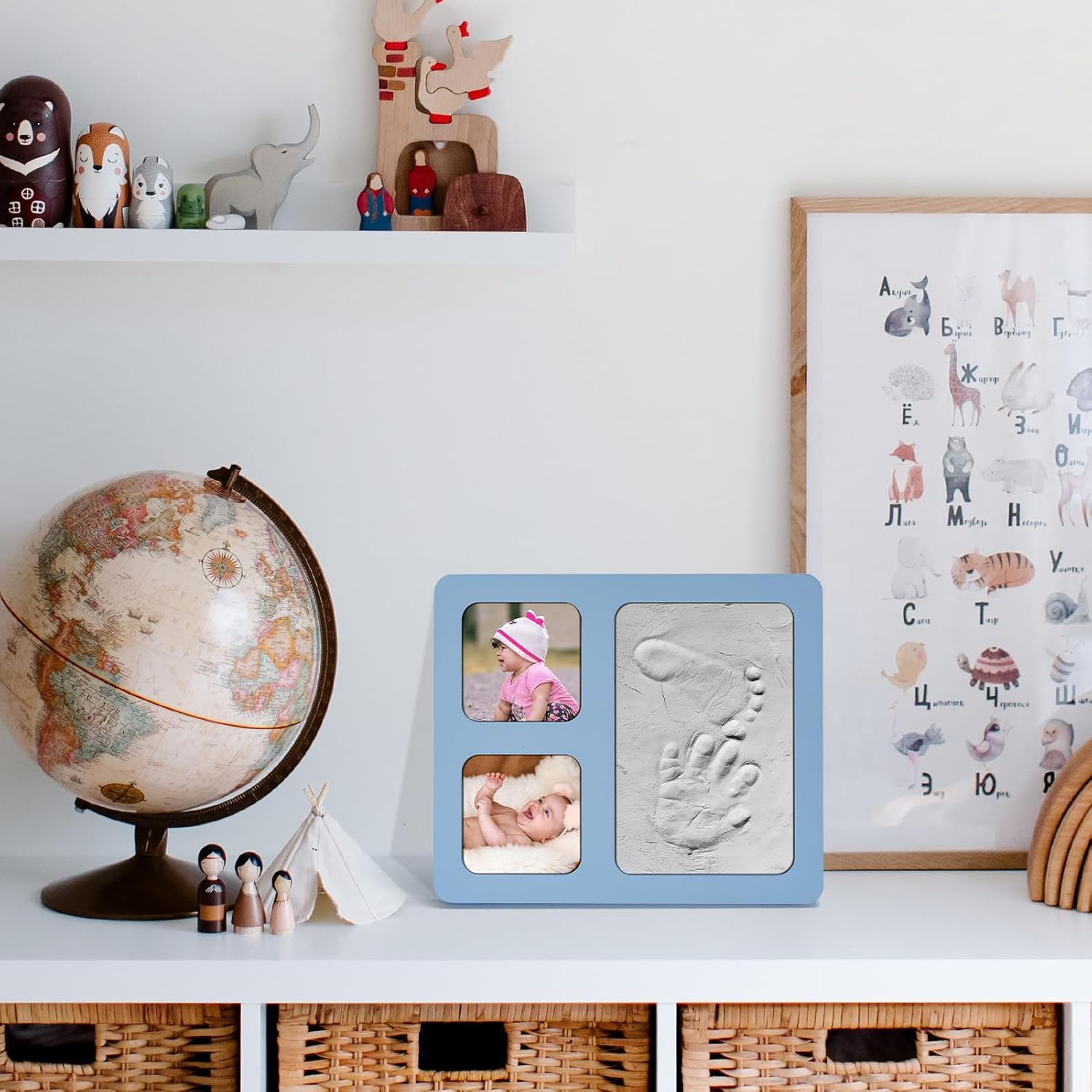 - Unique Design: The appearance of the baby hand and footprint kit frame adopts blue as the base color, and the frame has 4x6 inches of clay, which can hold 2 photos of 2.8x2.8 inches.