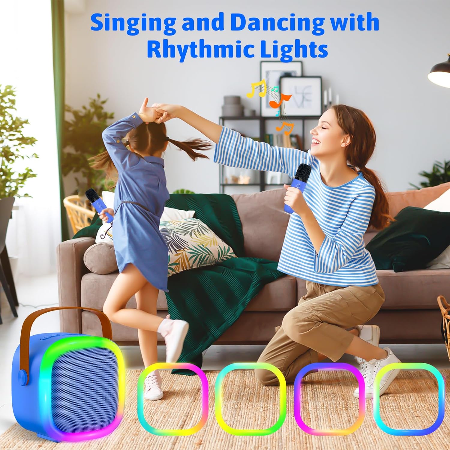- 【Compact and Portable】Mini kids karaoke system is designed with a durable handle,which is lightweight, wireless and highly portable.Perfect for family gatherings, birthday party, school activities,travel etc.Ensuring endless fun and creativity for children while the colorful LED lights sync to the music, enhancing the party atmosphere.Funny toys for age 4-12 year old kids