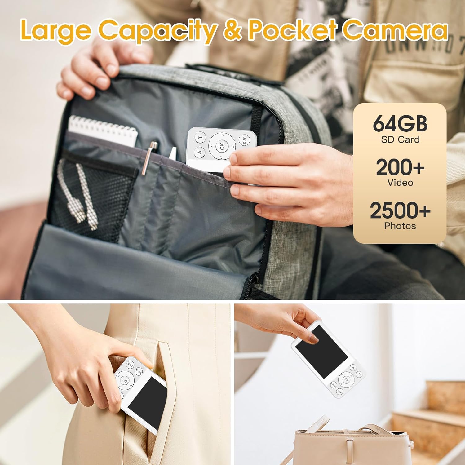 4K Digital Camera for Teens, FHD 64MP Digital Camera for Kids with 64GB SD Card, 18X Digital Zoom Cameras for Photography, Point and Shoot Video Camera for Kids, White