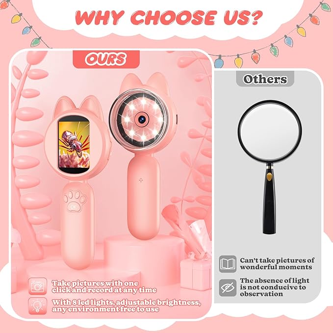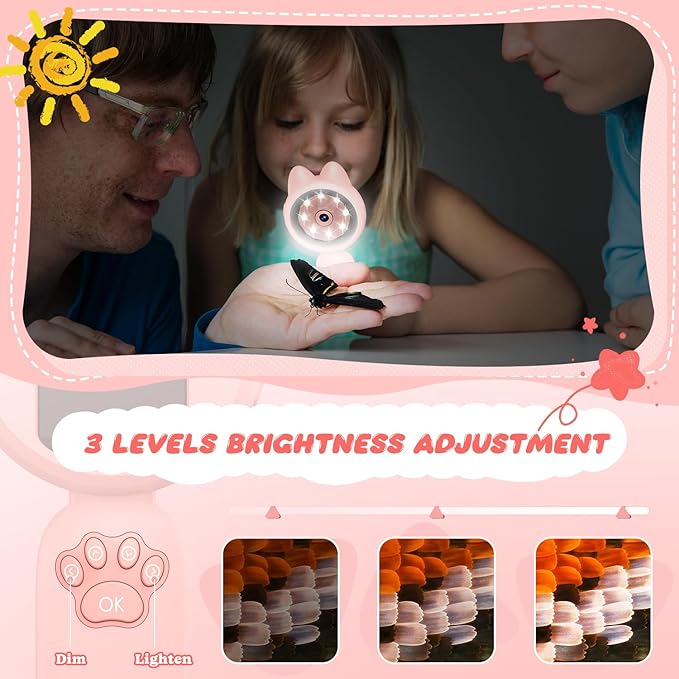 - Built-in Battery, Long Life, Suitable for Going Out to Explore: Equipped with a durable built-in battery, our magnifying glass ensures extended usage without the need for frequent recharging. Its robust design makes it ideal for outdoor use, enabling children to explore nature, study insects, or investigate the world around them without interruption