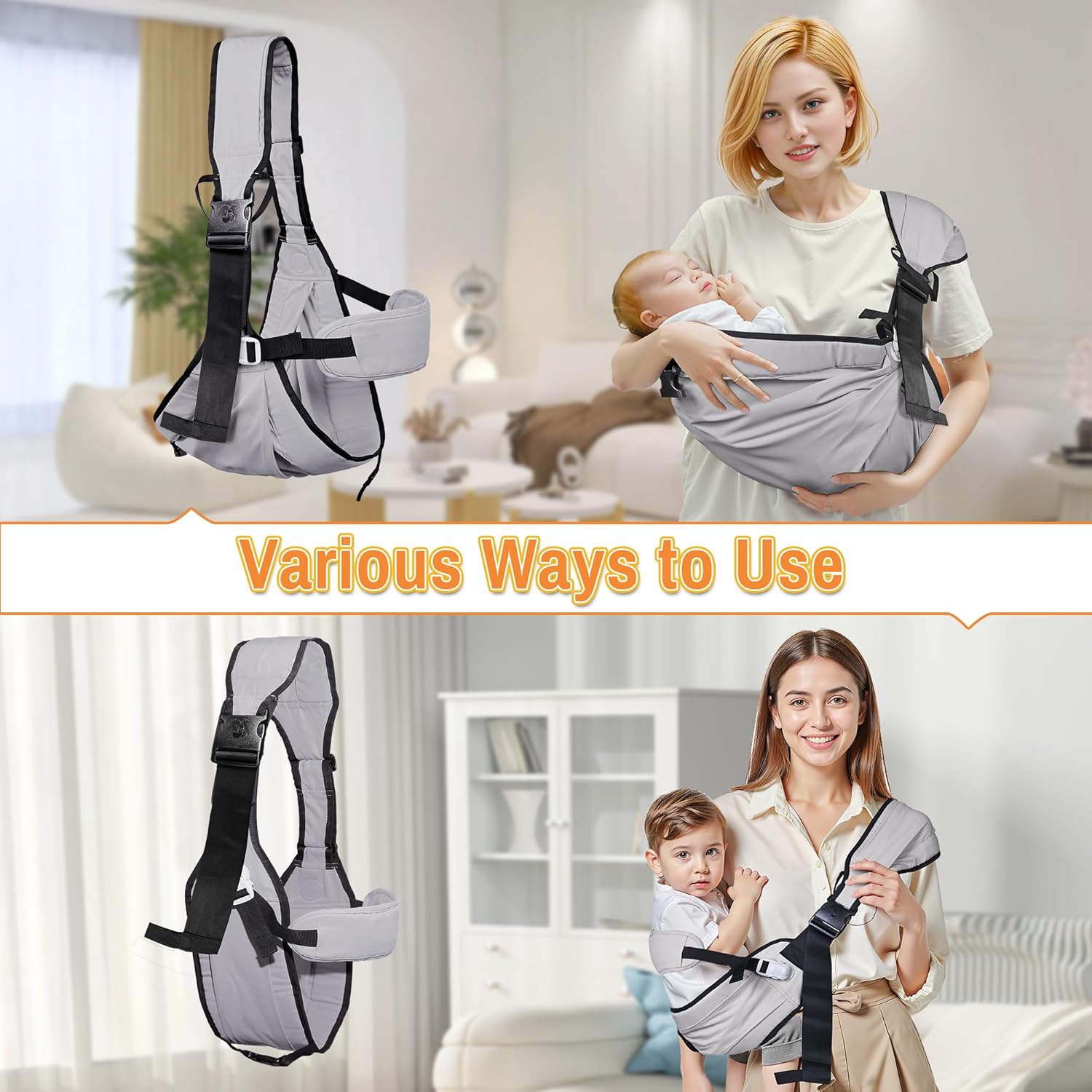 - 【Multiple Usage】The baby carrier can be used in many different ways, you can let your baby sit in the baby carrier, and also you can let your baby sleep in the carrier when you open the buckle at the bottom of the baby carrier. The different ways to use the baby sling carrier not only allows baby to sleep comfortably in the carrier, but also meets the needs of parents in different occasions.