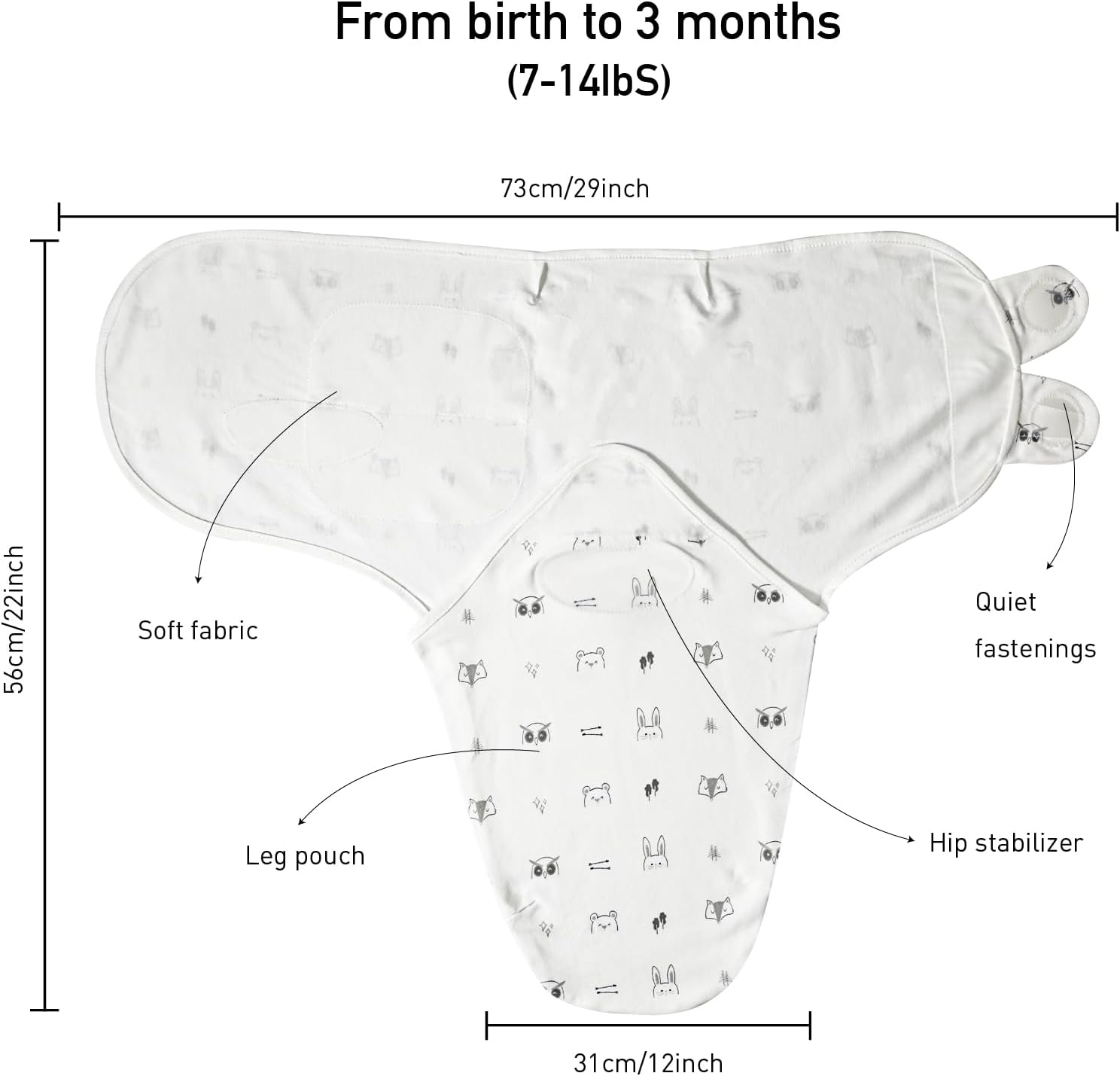- ADJUSTABLE FIT FOR YOUR BABY: The adjustable baby swaddle sleep sacks comes with soft fabric wings with secure hook and loop attachments, so you can easily adjust and achieve the ideal baby fit, helping to prevent the startle reflex and providing your baby with a soothing and comforting swaddling experience that mimics the womb environment.