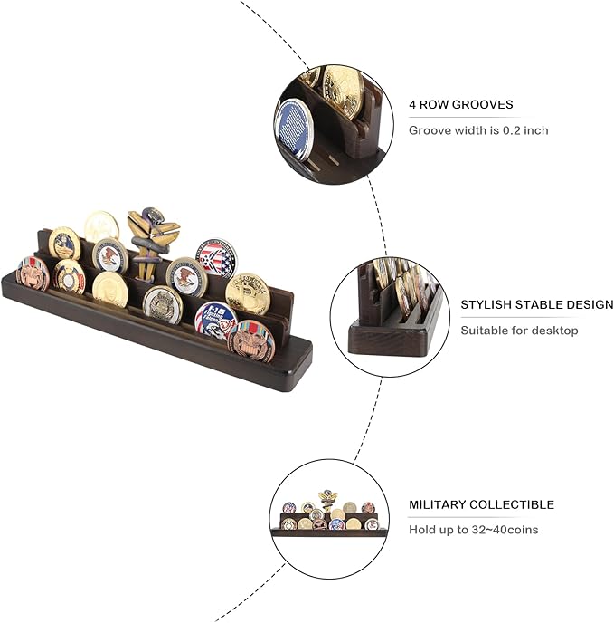 - HOLD MORE COINS: The Challenge Coin Display Stand is designed for challenge coins, with a larger display space of 8 rows for 15 to 18 coins, each row is equipped with grooves to hold the coins in place. Let your Navy challenge coins, military coins, casino chips, medals and more valuable collectible coins be proudly displayed.