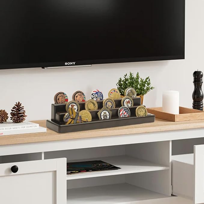 - BEST DISPLAY DESIGN: The step up Challenge Coin Display Rack with proper tilt easily displays each row of coins from any angle, giving everyone the best view of all your precious medals and commemorative medals. Whether you are a veteran, an avid coin collector, or just appreciate the significance of challenge coins, this Challenge Coin Holder is worthy of your choice and anticipation.