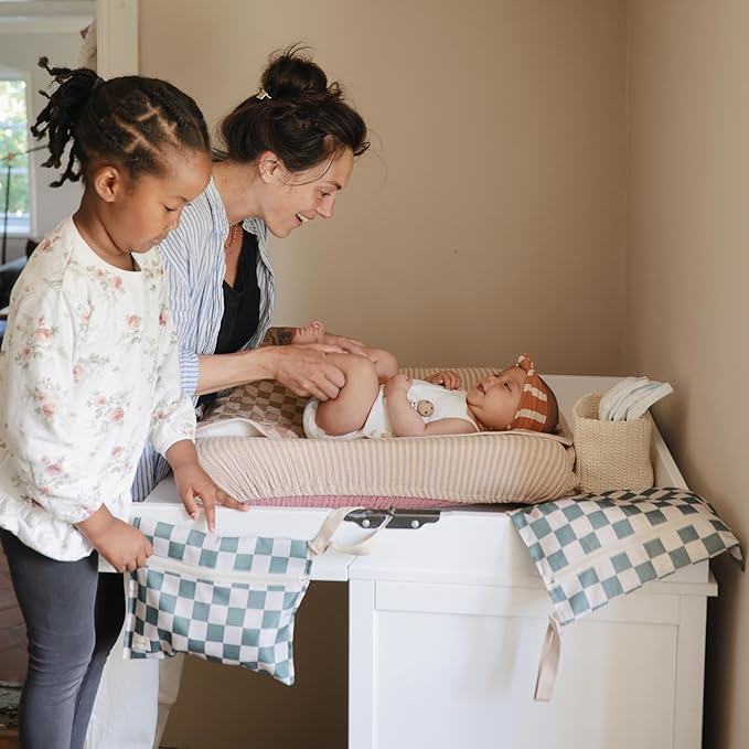 mushie Water Resistant Wet Bags | Large & Small Reusable Storage Bag for Baby Items and Travel | Zippered Pockets with Handle | Machine Washable, Set of 2 (Blue Check)