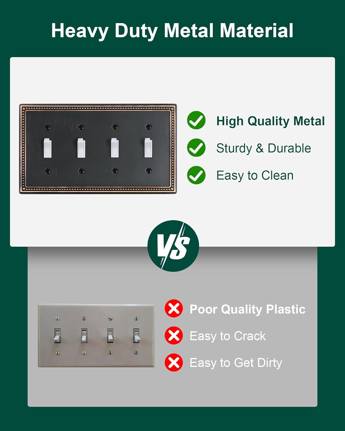 - Timelessly Elegant - The quad light switch plate covers feature an exquisite aged bronze finish with a traditionally styled beaded border. Offering a functional yet elegant enhancement to your home decor. Stylish wallplate effortlessly blends practicality with a refined decorative accent and sophisticated charm.