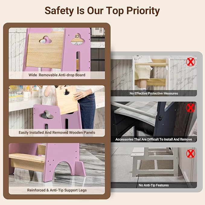 - Wide Anti-Drop Board: Designed for safety, this learning stool features a spacious, removable anti-drop board that ensures your child will never have to worry about falling. Easy to install and remove, it allows kids aged 3 and up to use it independently, giving parents peace of mind while their little ones explore and learn in the kitchen.